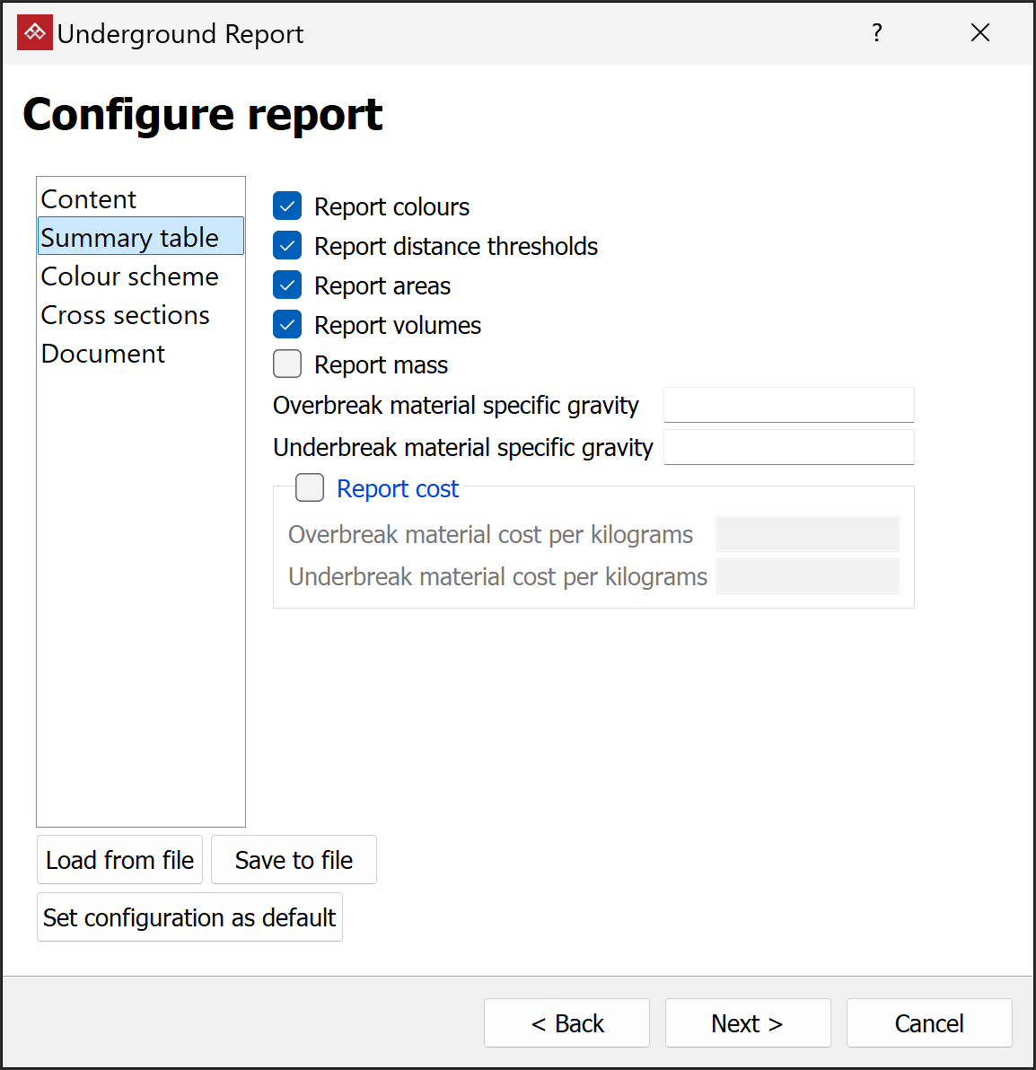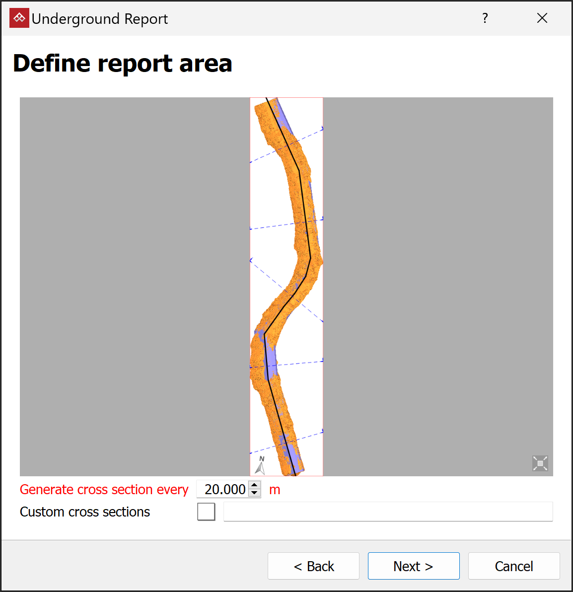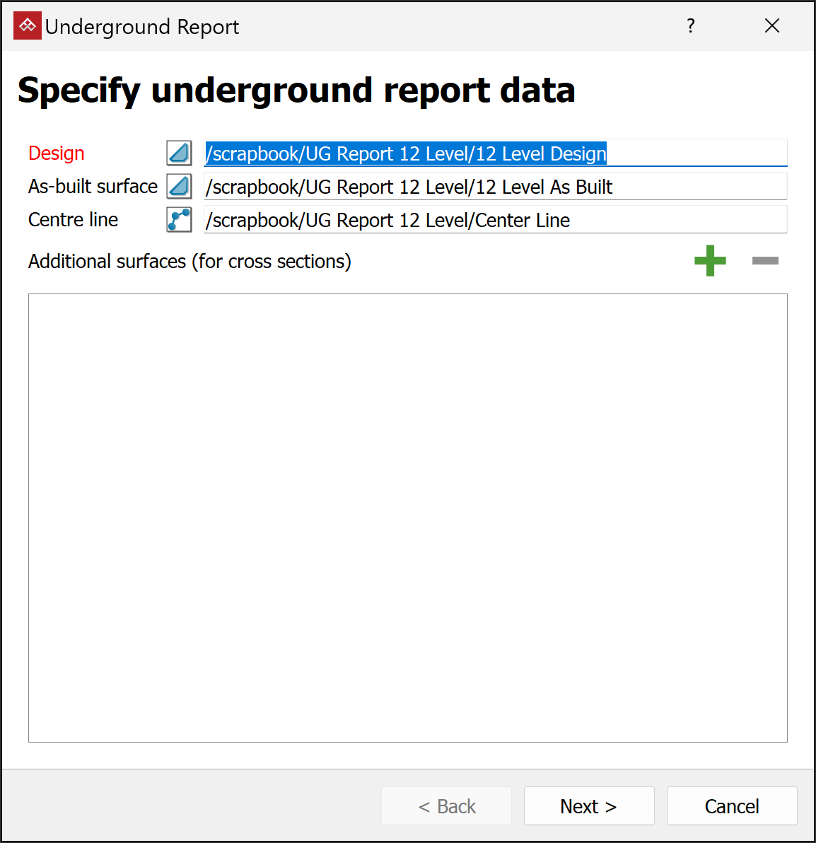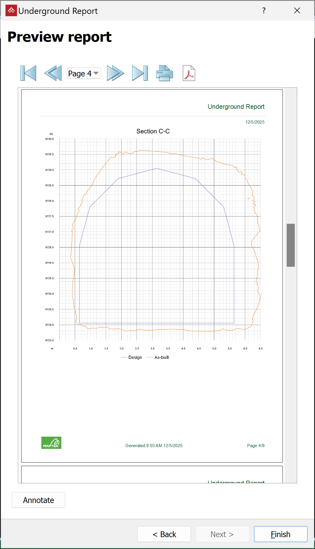 The Underground Report tool allows you to create reports detailing the conformance between the design surfaces of a tunnel or void, and objects representing the as-built surfaces (all with ends). These reports are useful for determining the amount of underbreak and overbreak resulting from digging or shotcrete application thickness.