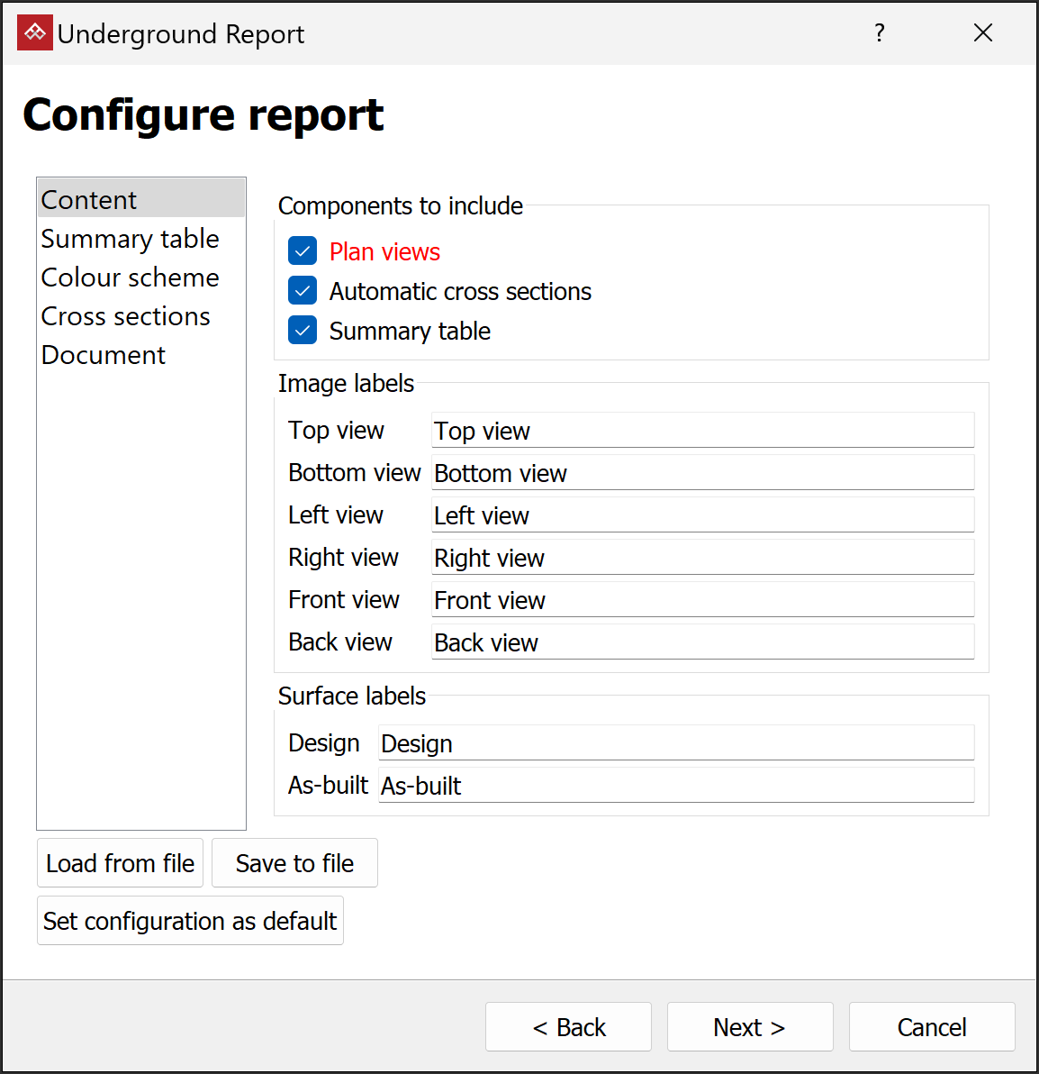 • Content. Select components to include in the report, and apply appropriate image and surface labels. For example, if the surfaces are for shotcrete analysis, the could be renamed pre-shotcrete and post-shortcrete.