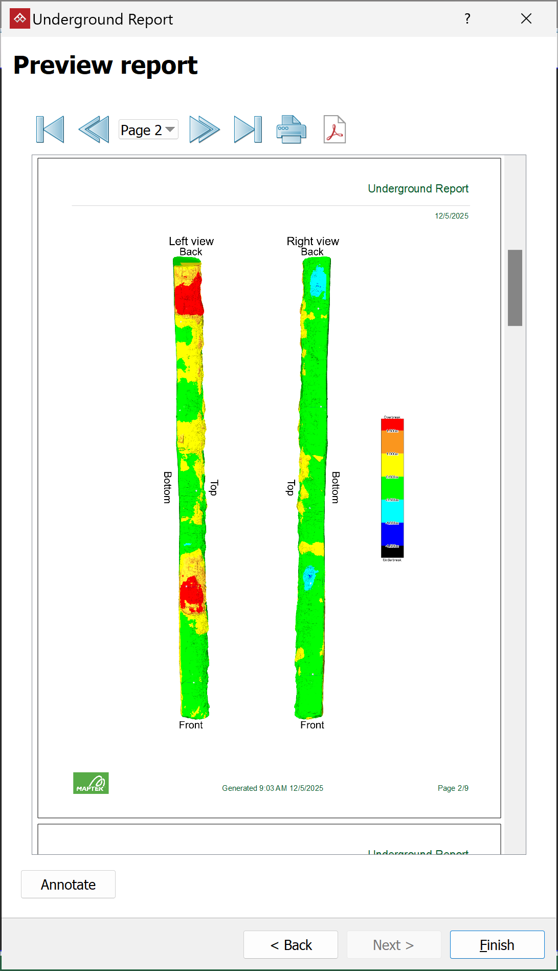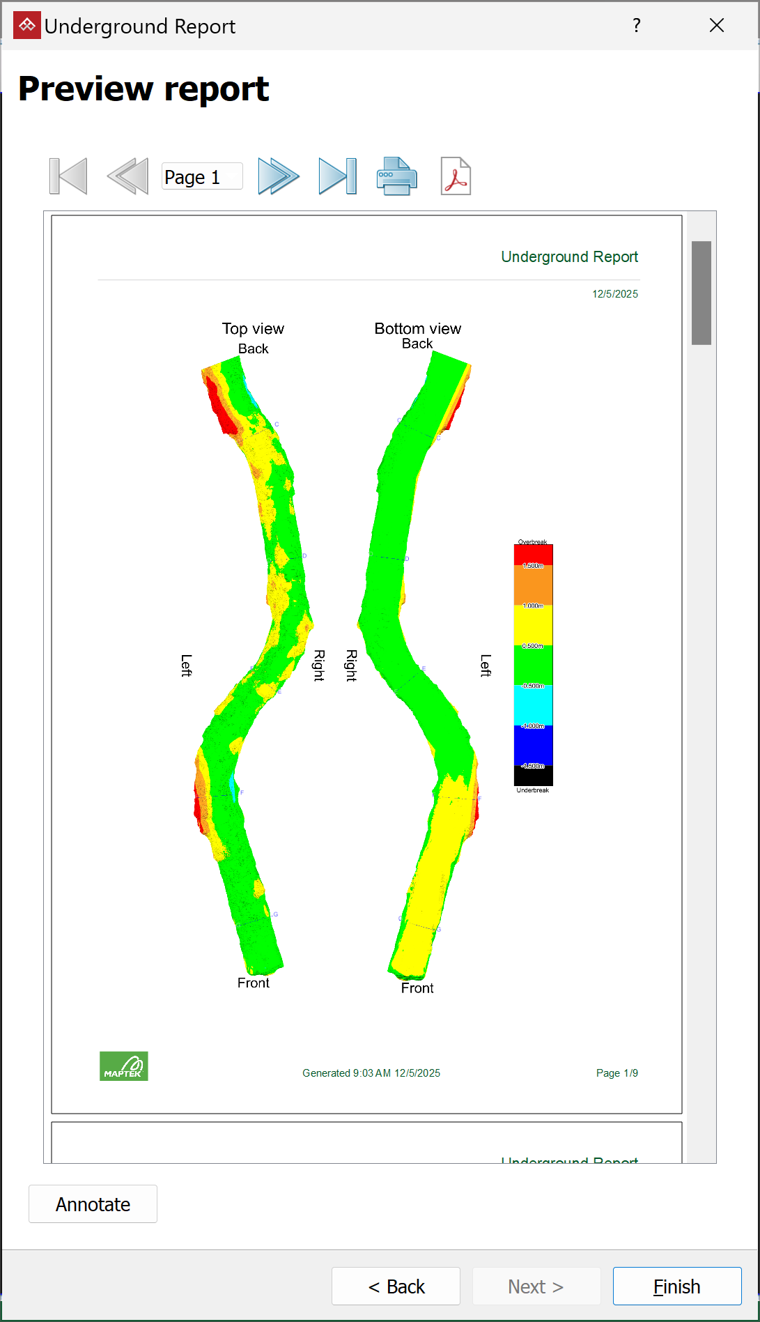 The report will display left, right, top, bottom, front and back views of the underground tunnel.
