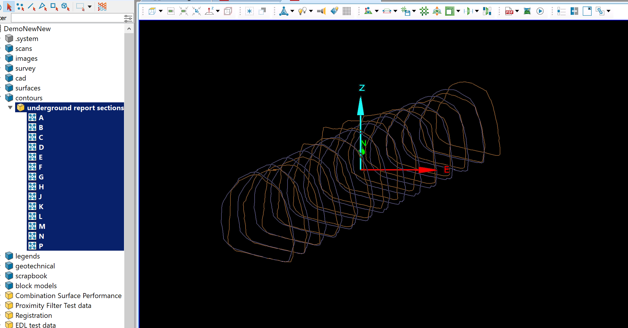 When creating sections for the underground report, PointModeller will save the sections in a custom container called underground report sections in the contours container.