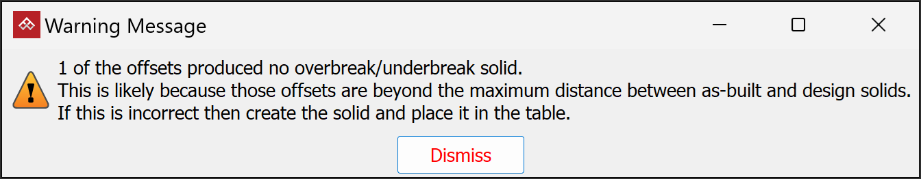 8. The analysis produces solids representing each of the overbreak and underbreak criteria as specified by the colour scheme setup. Leaving the report tool open, review each solid with the Surface Validity tool. Fix any errors found.
