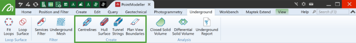 The Create group on the Underground tab contains tools for advanced tunnel modelling, best applied after creating surfaces and filtering services and mesh.