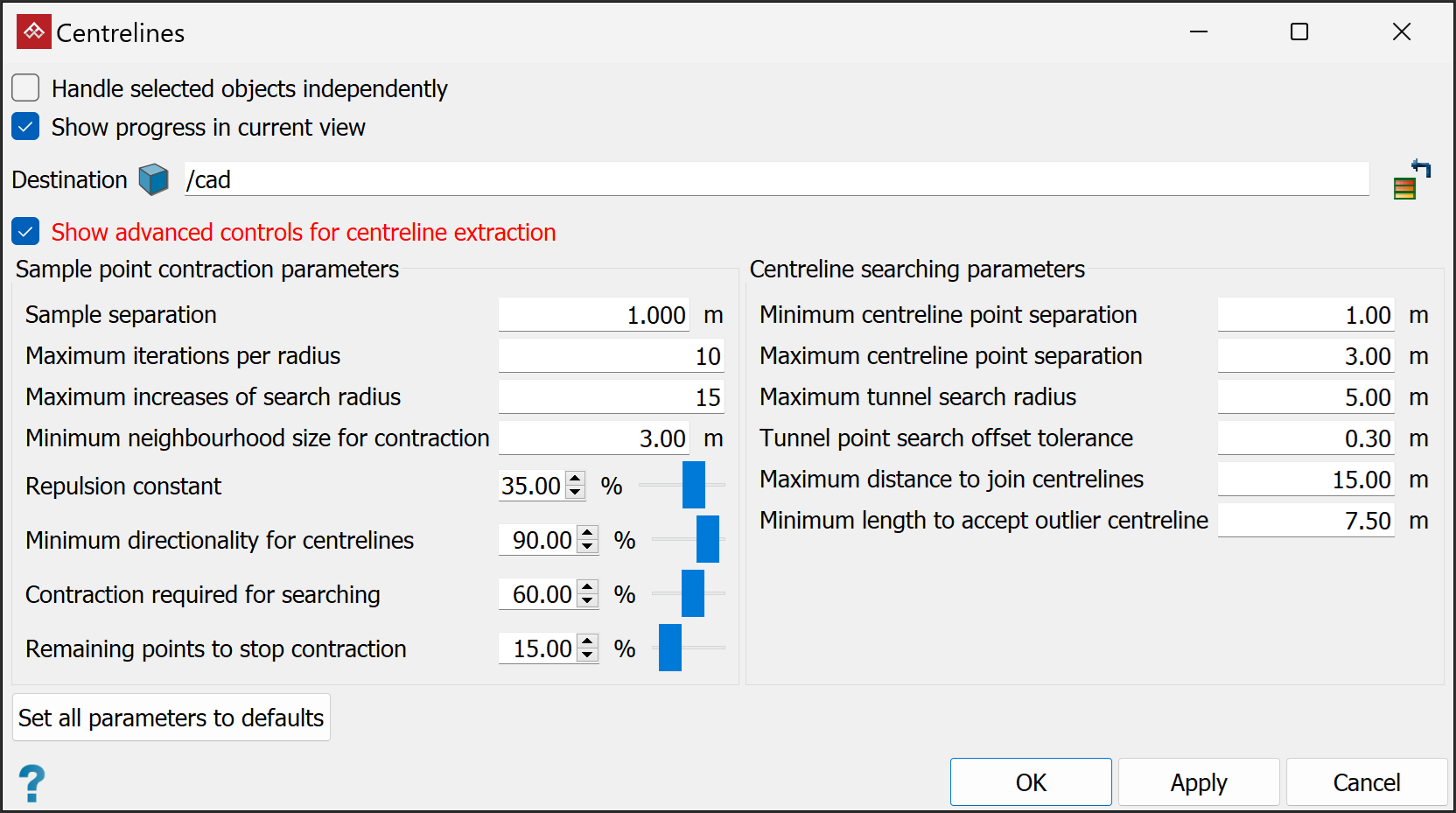 If necessary, select Show advanced controls for centreline extraction to adjust the centreline detection parameters. Do this particularly if results from the default parameters are unsatisfactory.