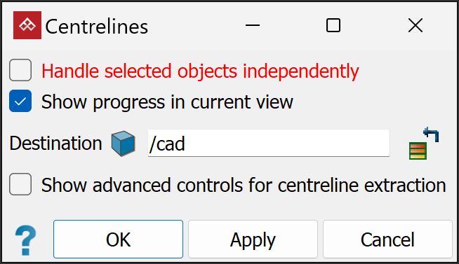 If you check Show progress in current view, centrelines will be loaded and displayed in the active view window as they are being created. This will help you to adjust the advanced parameters for a second run. If Show progress in current view is cleared, centrelines will only appear in the project explorer.