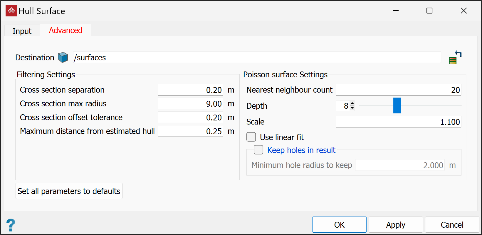 The hull surfaces will be created and nested inside the container specified in the Destination field on the Advanced tab (surfaces by default).