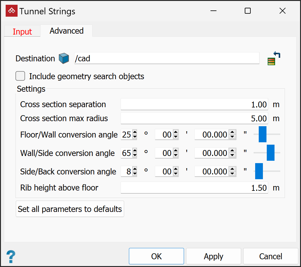 (Optional) Select Include geometry search objects to be able to analyse how the resulting tunnel strings were determined.