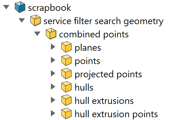 planes These show the areas along the centreline that have been used to find the tunnel's shape. A single plane should capture all surrounding walls of one tunnel in a system. If the planes are too large they will detect data on nearby tunnels; if they are too small they will miss parts of the tunnel at that position. Adjust the size of these planes with Cross section max radius in the Advanced tab. points The points represent the original points in the system which are considered to be on the plane. Cross section offset tolerance is the maximum distance a point can be from a plane to be considered on that plane's search. projected points A set of points representing the points found in points projected onto the plane from planes. hulls A convex hull wrapping the projected points. hull extrusions The convex hull, extended by Cross section separation to produce the total hull area at this cross section.