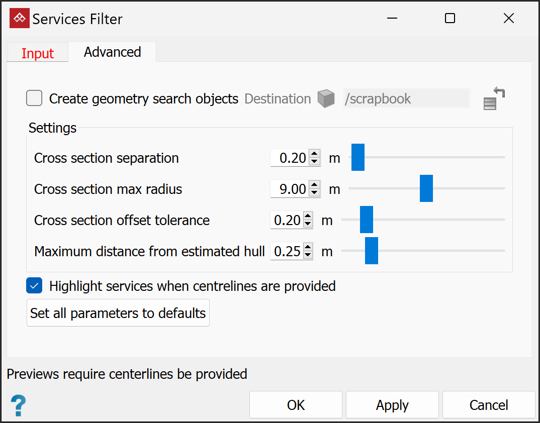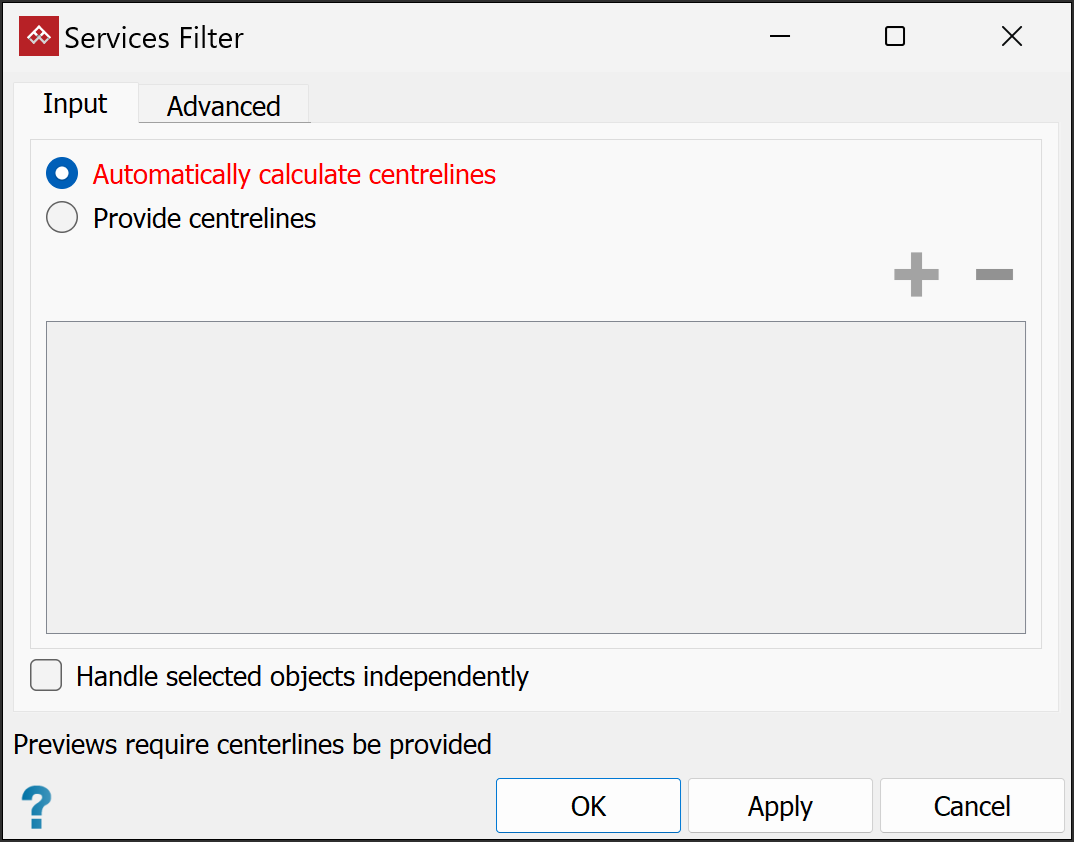 button.Note: If you select Automatically calculate centrelines, centrelines are only calculated for the purposes of services filtering; no centreline objects are created.