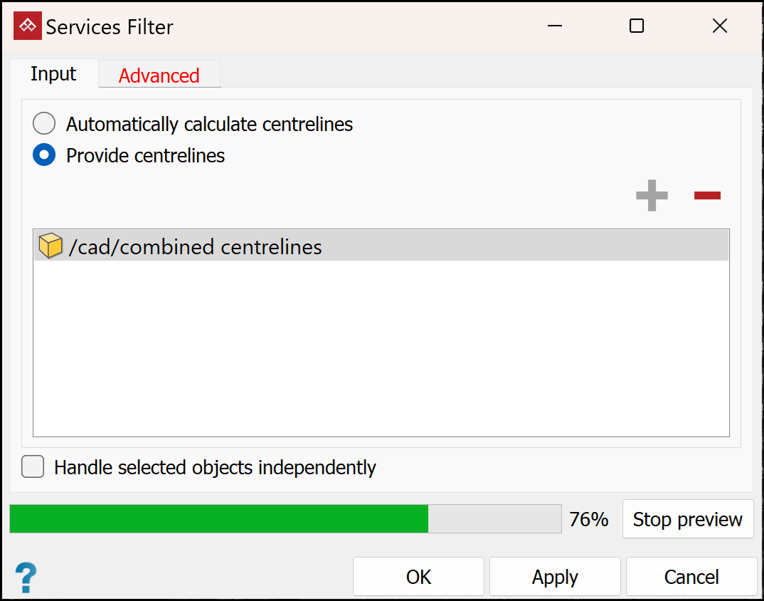 If you provide centrelines, the services filter tool will generate a preview of filter results as soon as you select at least one scan. You can interrupt preview generation by clicking Stop preview.