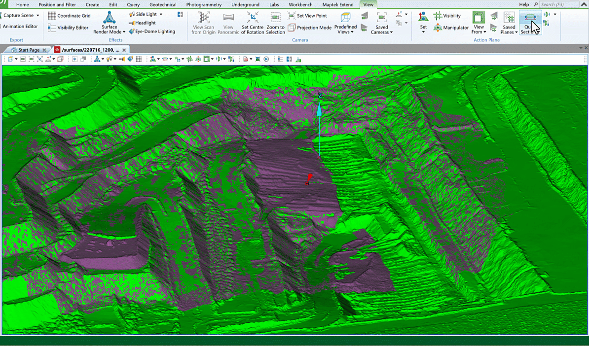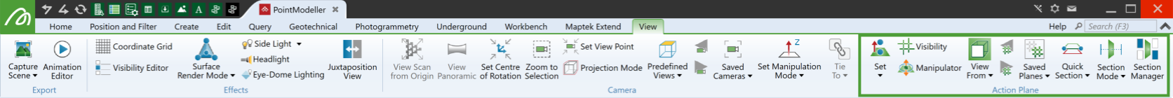 The Action Plane group tools on the View tab enable you to configure and work with action planes, including viewing cross-sections.