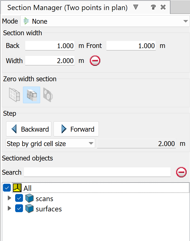 Force sections of block models or surfaces to always have zero widths using the Zero width section buttons.