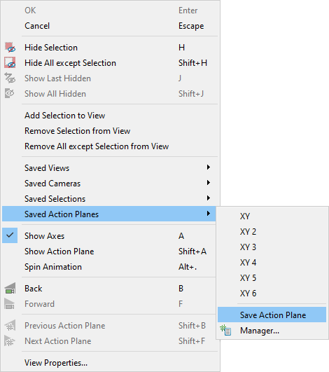 Right-click in the view window to open he context menu, then hover over Saved Action Planes and click Save Action Plane.