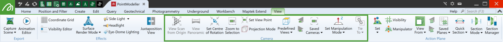 In PointModeller a view location is known as a camera. The Camera group on the View tab contains tools that allow you to change and manage viewing directions and positions.