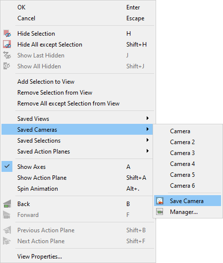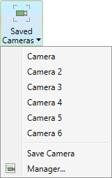 Save cameras, recall a saved camera, and manage saved cameras. |