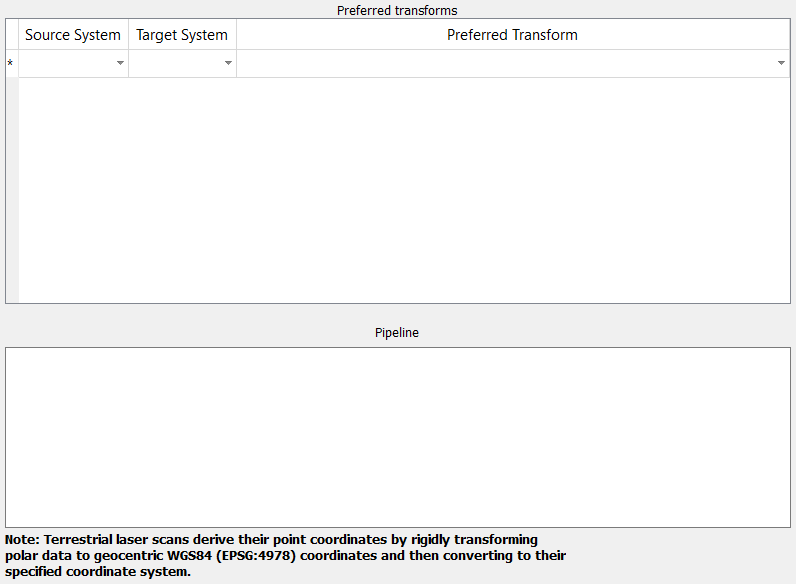 Preferred transforms: When coordinate systems are defined in the General tab (see above), they will appear in the Source System and Target System lists. To set a default transform, select a source and target system, then select a transform from the Preferred Transform list.