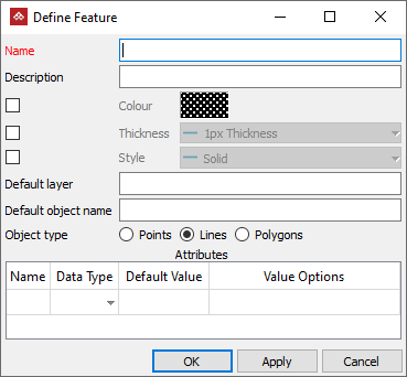 Default object name: Enter a new object name that will be given to objects created with this feature. Optional.