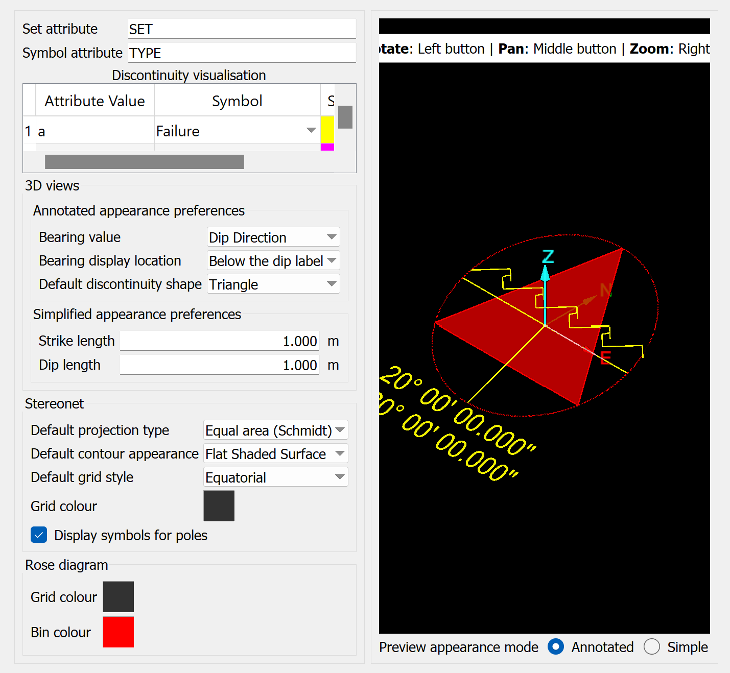 Note: Changes to stereonet preferences only apply to new view windows.