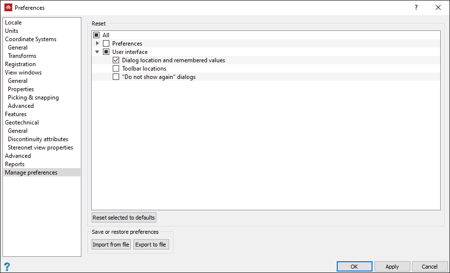 You can also save or recall preferences configurations with the Export to file and Import from file buttons.