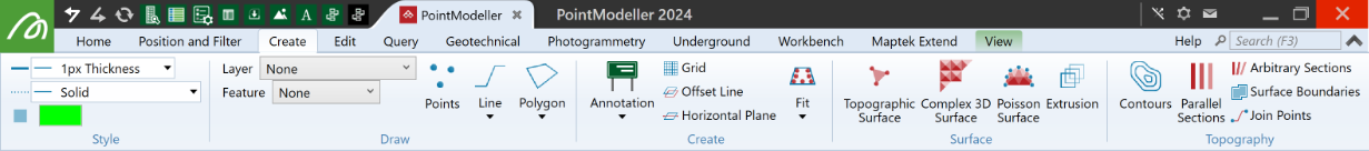 The Create tab hosts tools for creating CAD objects, surfaces, annotations, and topography objects.