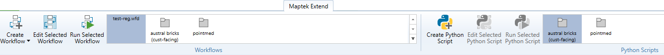 The Maptek Extend tab offers tools for creating Workflow components using Python scripting. These tools can be used along with the existing Maptek software components.
