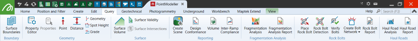 The Query tab hosts tools for analysing spatial objects, calculating dimensions and quantities, comparing as-built data with design, and generating detailed reports from the results.