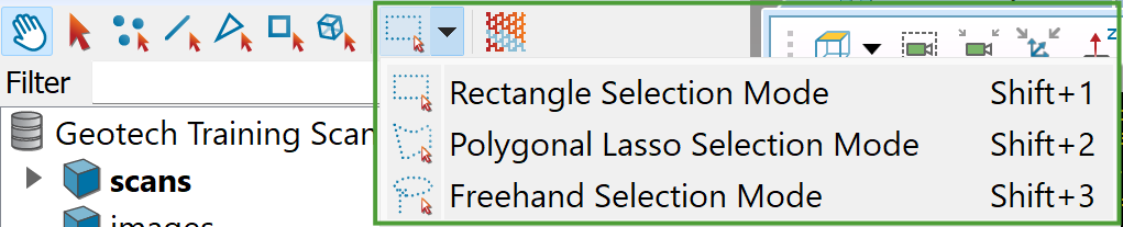 Selection modes determine how boundaries are drawn around objects and primitives for selection. Options are: