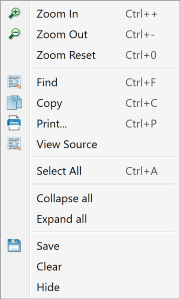 Right-clicking elsewhere in the report window opens the following context menu, containing generic Windows operations:
