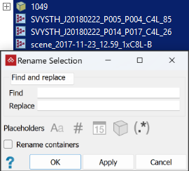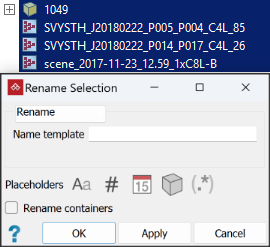 Rename the contents of a selection in bulk. Options are a simple replacement name template, or a find-and-replace process. Where objects are not uniquely identified by the new name template, auto-numbering is applied.