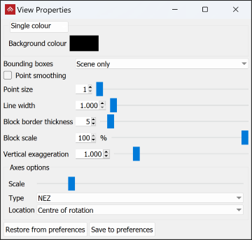 View Properties... Opens the View Properties panel where you can alter various properties of the view, such as appearance and location of the axes, background colour, render sizes of points, lines, and scale of objects in the view.