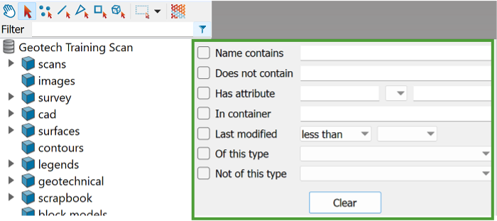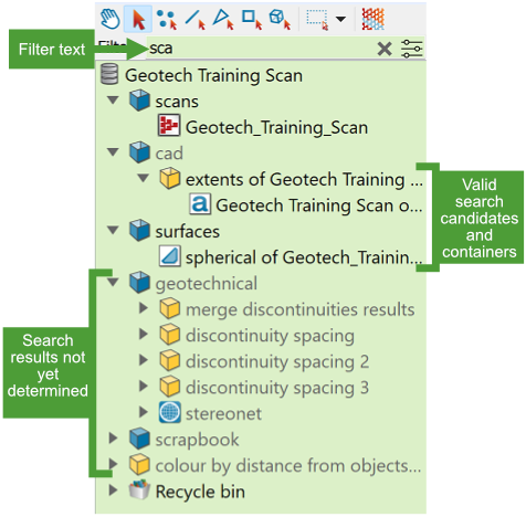Note: As with the simple search, as soon as any criterion is provided, the project explorer’s background turns green, and valid search candidates and their containers will be darker than the rest. The filter criteria will also appear as a string in the text box.
