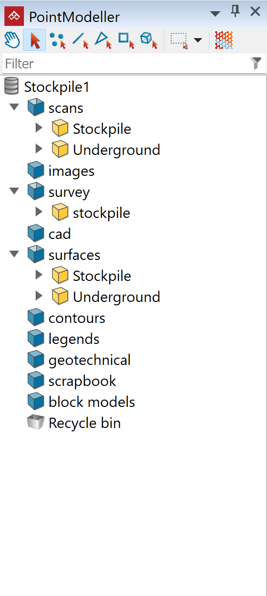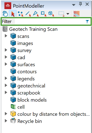 An icon next to an object name indicates the object type. The following table lists the most common object types you will see in PointModeller: