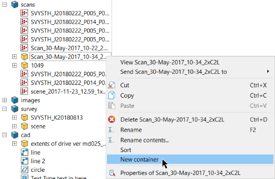 Custom containers can be created by right-clicking on the project or a container and selecting New container from the context menu. These will be displayed with a yellow container icon