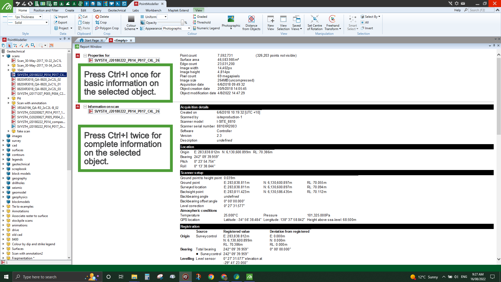 Tip: Hold Ctrl and press I twice to display the properties and detailed information of the selected scans or objects immediately.