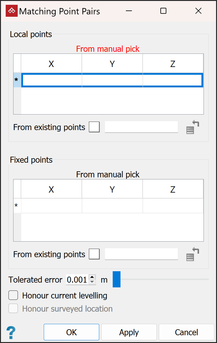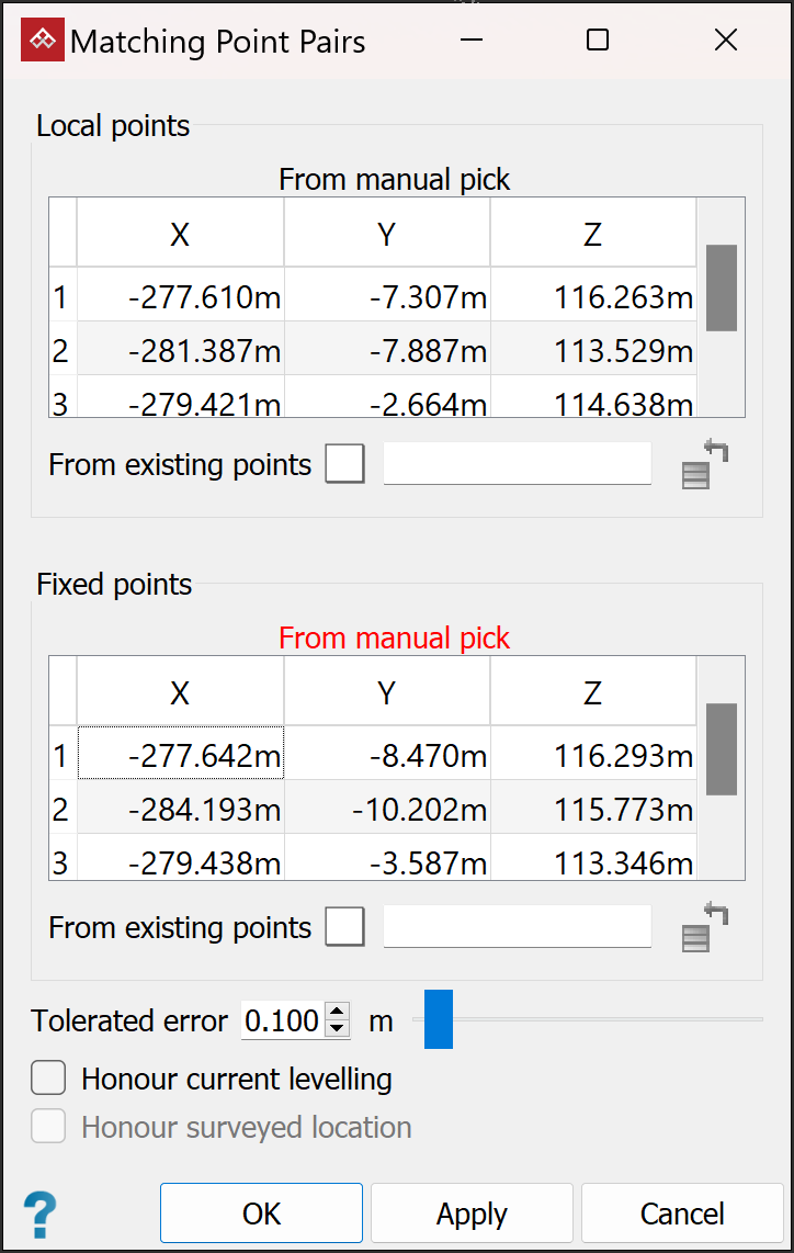 Note: From manual pick allows the local and fixed points to be loaded in separate views. However, all local points must be in one view, and all fixed points must also be in one view.