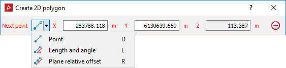 - Enter as many points as required to build your polygon, while selecting the desired mode of relationship between points (Point coordinates, Length and angle, Plane relative offset).