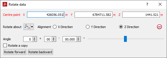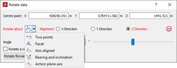 - Select a Centre point of rotation. The centre of rotation can be clicked on in the View window or entered.