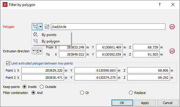 - Drag and drop the polygon into the Polygon field, otherwise create a polygon region from within the Filter by polygon function using By points or By polygon. The projected polygon boundary is displayed in grey.