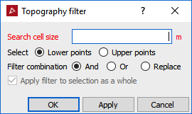 The topography filter divides the scan data into a horizontal grid with a defined cell size. Only the single lowest or highest point in the cell is retained. This removes unwanted features and reduces the data to a more even point distribution.