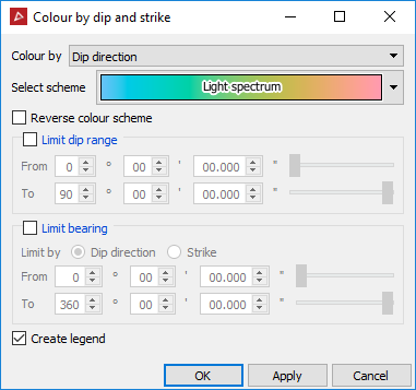 Select the colour scheme from the drop-down list. The options will vary depending on whether dip or strike is selected in the Colour by field.