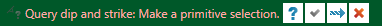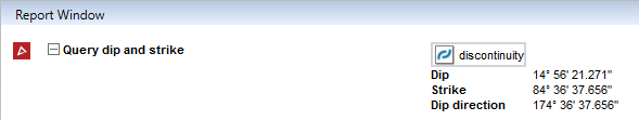 Dip and strike query displays the dip (angle of descent) and strike (angle of intersection with a horizontal plane, relative to north) of a feature.