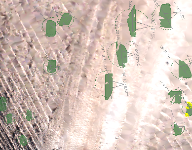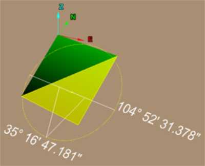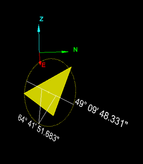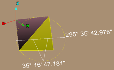 This software identifies Dip and Strike of sloping faces by highlighting segment(s) and drawing a yellow circle around these. A white horizontal line is also drawn with a 'V' shape pointing down in the direction of the Dip. The Strike angle (clockwise from North) is identified on the side of the circle in the direction of the Strike Direction. The Dip angle (down from horizontal) is specified at the bottom of the shape.