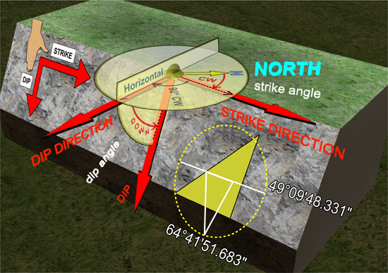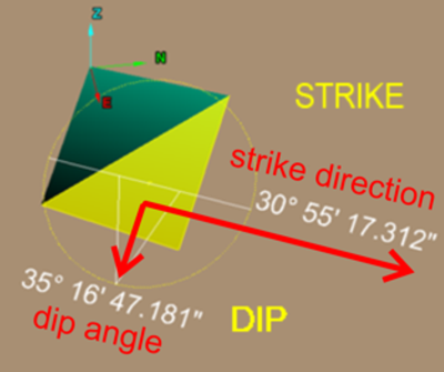 Dip and Strike has to be defined in order to ensure consistent results. Different methods are available for defining Dip and Strike. The approach used in this software is based on the 'American Right Hand Rule' method.'