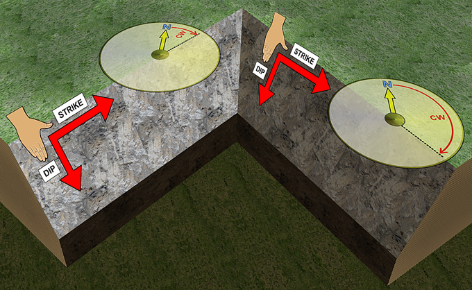 - The right thumb will point in the direction of the Strike. The Strike angle is measured clockwise from the North direction.