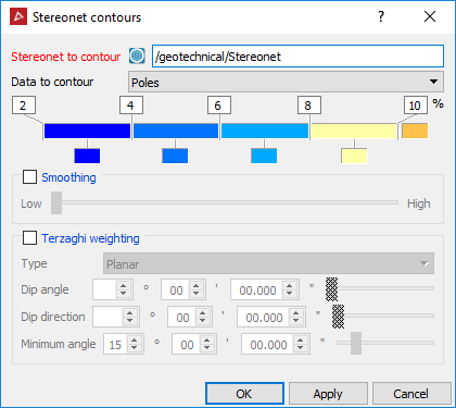 - Select whether you want contours around poles or intersections. Select the colours and values for the percentage bandwidths to represent the data concentration.
