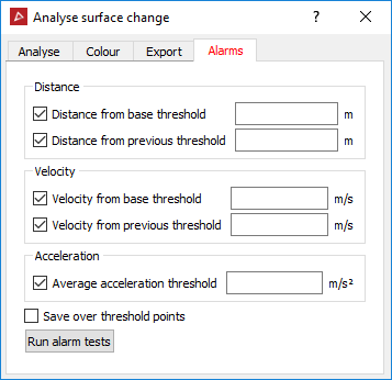 Select the Distance, Velocity and or Acceleration checkboxes to have alarm thresholds defined. (Acceleration requires comparison of at least three surfaces.)