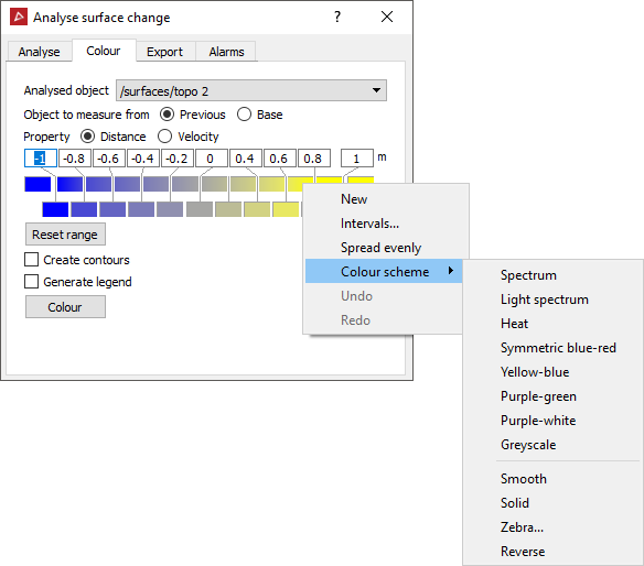 Select the Colour scheme to be used by right-clicking on the coloured cells in the colour scheme editor. Several attributes of the colour scheme can be adjusted including the colours of each segment, the minimum and maximum values of the range, and the distance between colour segments. Preset colour schemes are also available.