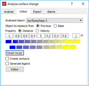 The Colour tab enables the analysed surfaces to be coloured based on the movement (or velocity of movement) from a previous surface.