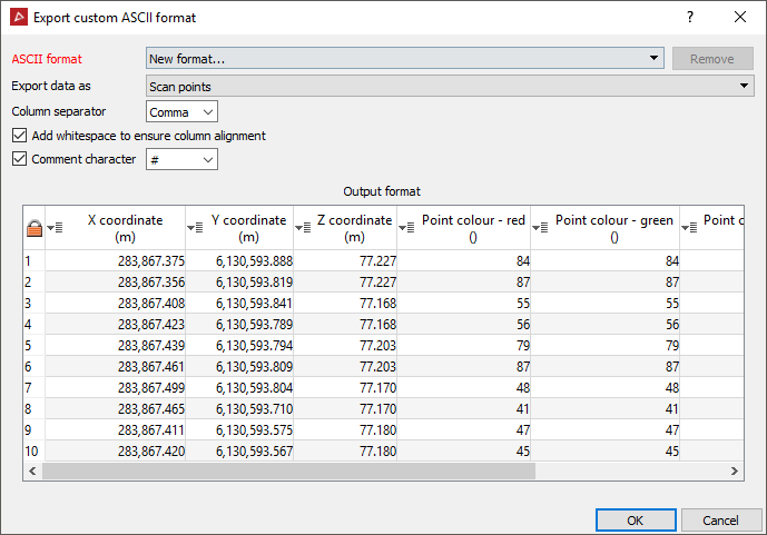 To export a text file (ASCII file) that is not in one of the predefined PointStudio formats listed above, use the custom text file export method below: