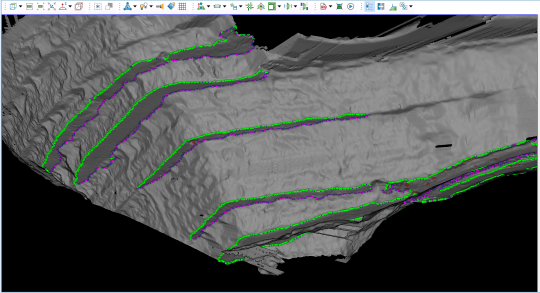 Features enable you to apply distinctive characteristics to CAD objects, such as points, lines, and polygons. For example, you could apply specific line styles and colours to differentiate toe and crest lines. You could also use features on polygons defining different stockpiles.