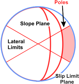 Slip limit Great circle representation of the plane at which friction slipping will occur. Poles (normals) closer to the outside perimeter of the main circle are steeper, so will slide or topple. Note